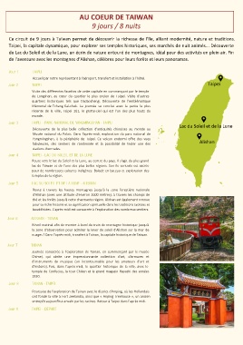 Ce circuit de 9 jours à Taïwan permet de découvrir la richesse de l’île, alliant modernité, nature et traditions.