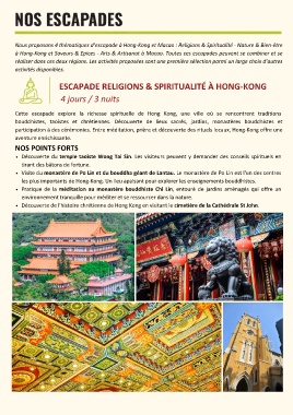 Nous proposons 4 thématiques d’escapade à Hong-Kong et Macao : Religions & Spiritualité - Nature & Bien-être